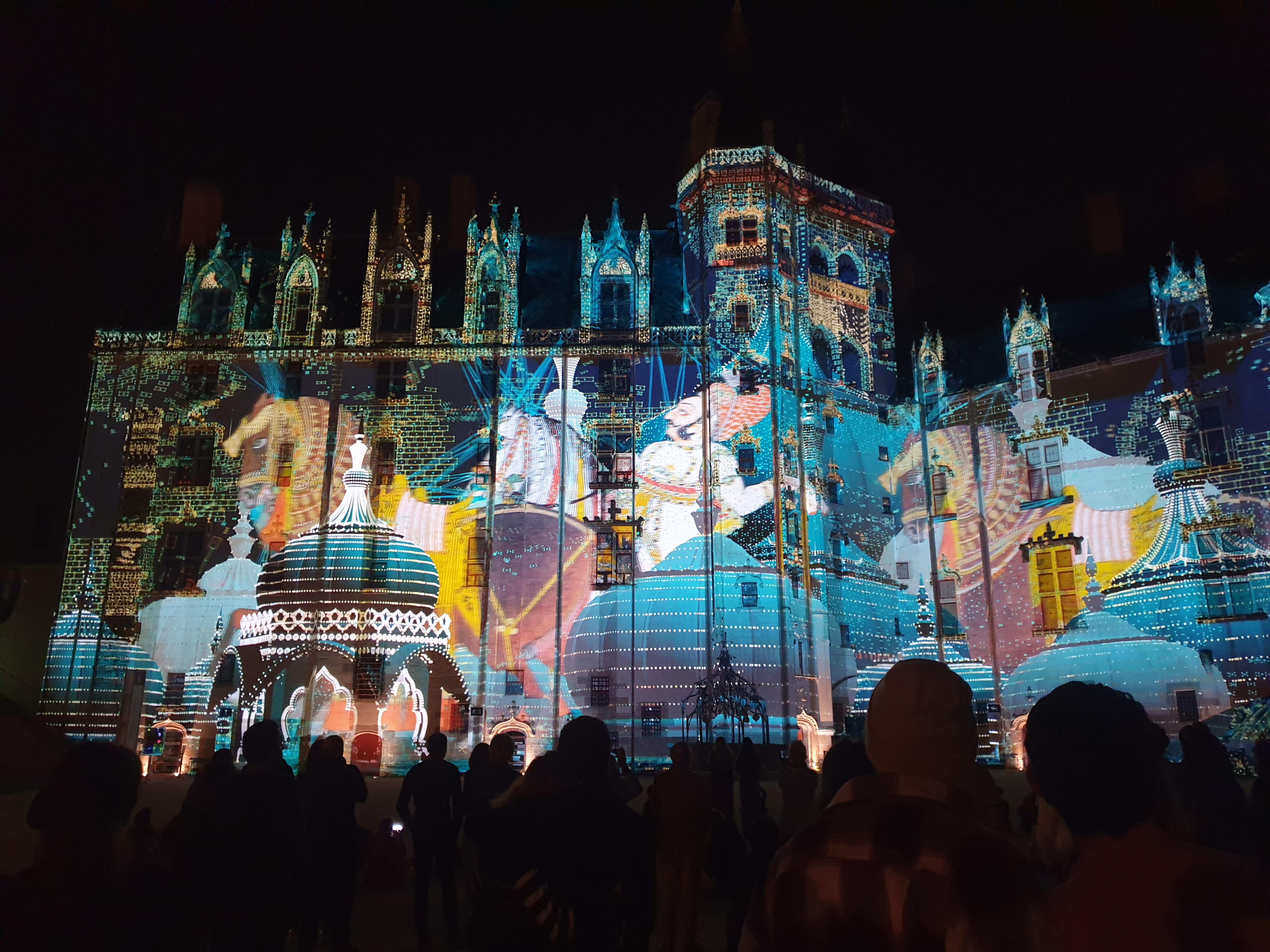 La deuxième installation se déroule, elle, dans un autre lieu de la ville. Le Château des ducs de Bretagne se transforme en temple d’Inde. C’est la projection Cachemire de l’artiste français Yann Nguema.