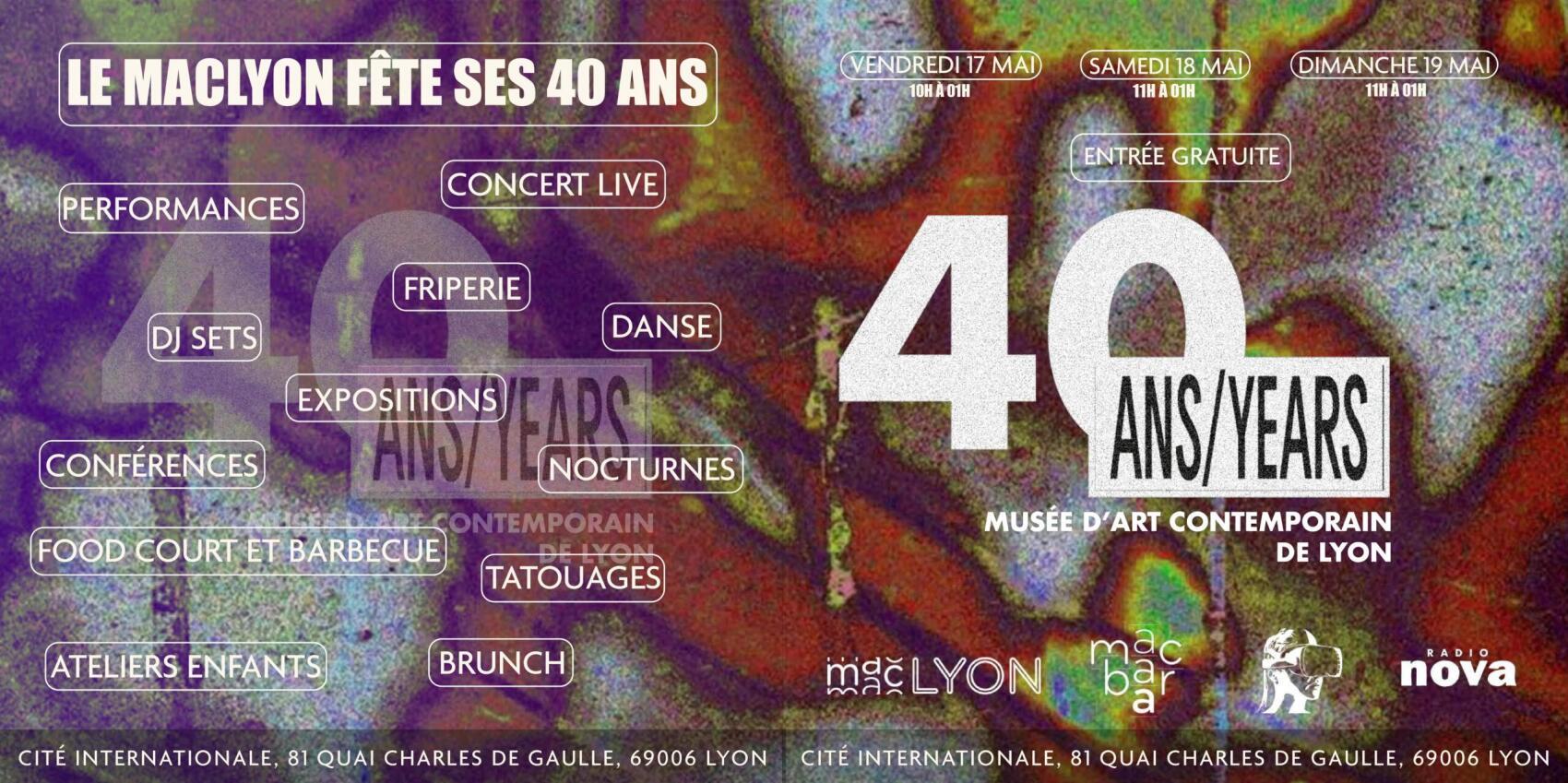 Au programme : tables rondes sur l’histoire du macLYON vendredi 17 mai, des performances et une Nuit des musées avec le macBAR et le collectif La Tête Qui Bouge samedi 18 mai ou encore une journée entre danse et concert avec l’Orchestre National de Lyon et le Centre Chorégraphique National de Rillieux-la-Pape dimanche 19 mai.