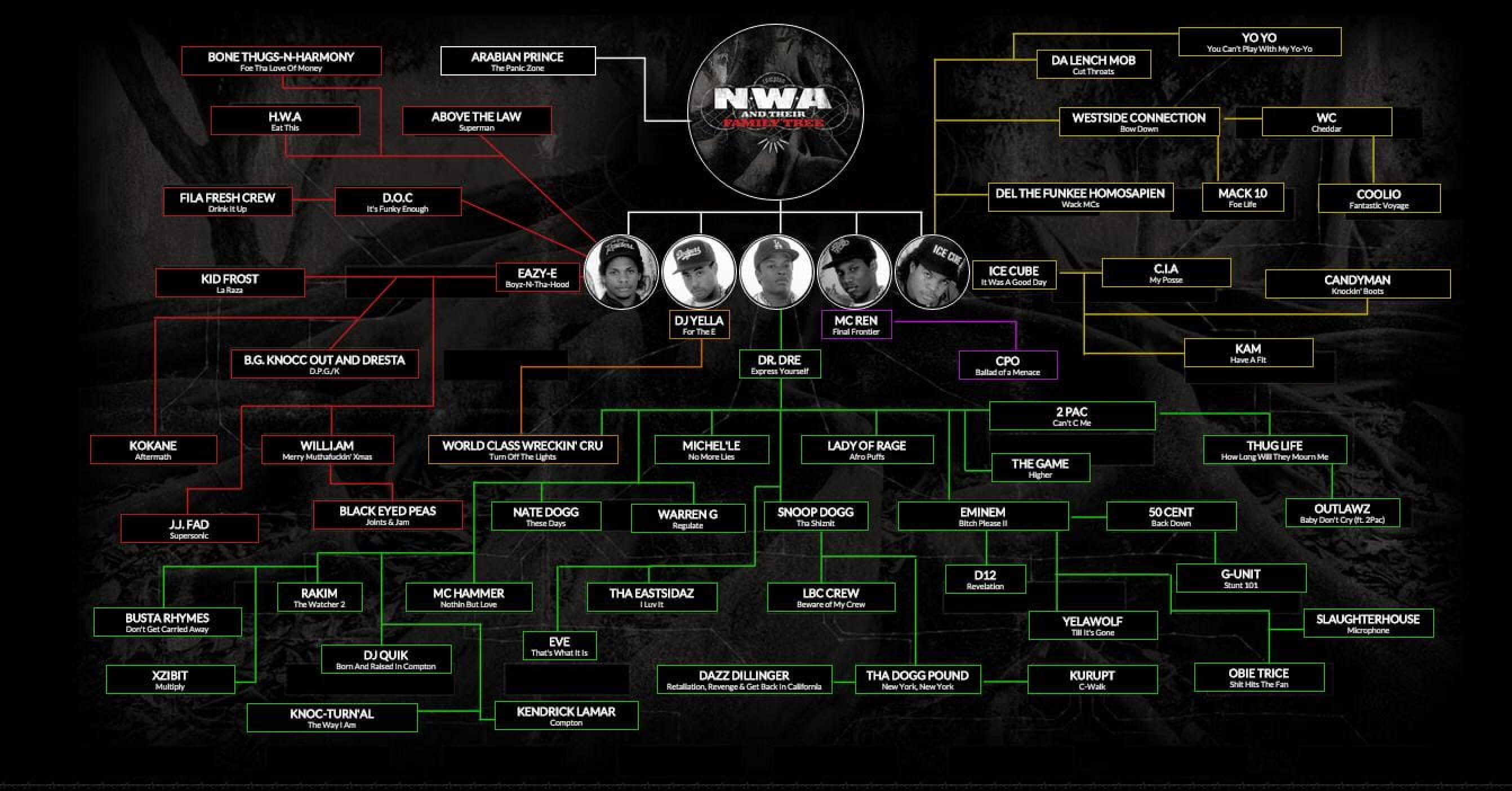 Et tant que nous y sommes, on vous ajoute ce petit bonus, un arbre généalogique interactif qui retrace toutes les ramifications qui découlent de ce tout premier groupe, fondateur du Gangsta Rap, et ça se passe par là –> http://nwafamilytree.com/
