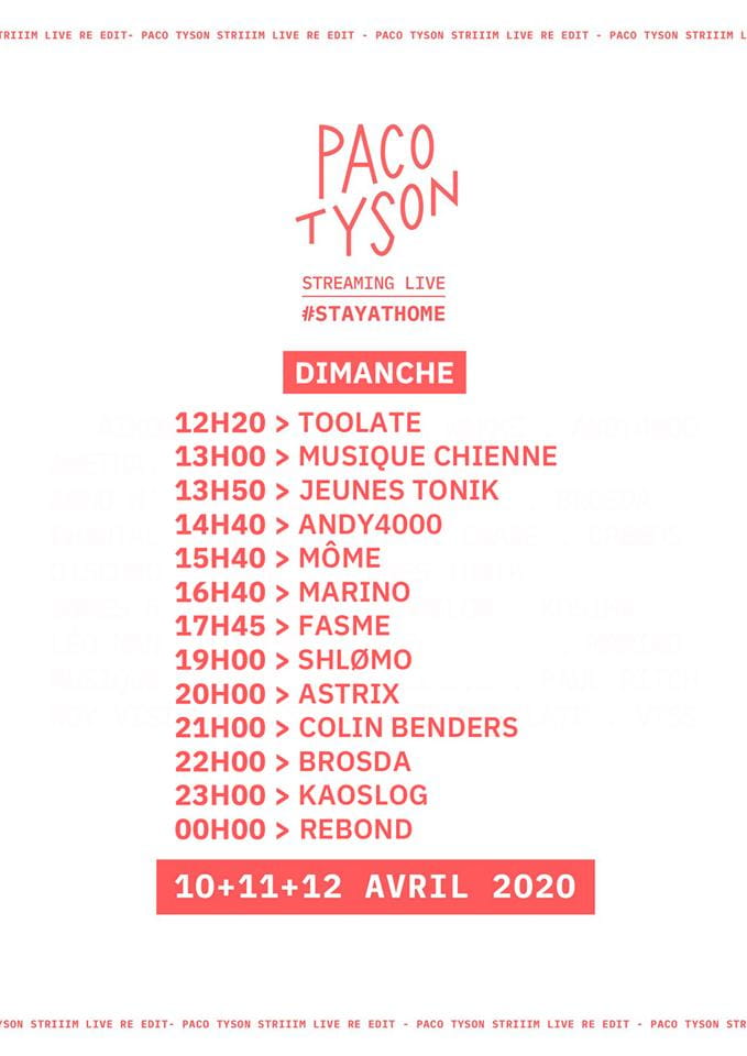 Alors remercions l’équipe du Paco Tyson et les artistes qu’on aurait du croiser en live, ce week end à Nantes de nous offrir trois jours de sessions électro de haut vol, livrées direct dans les baffles du salon !