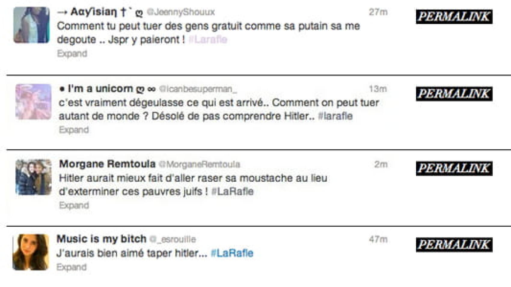 Des punchlines de dislikke genre « J’aurais honte d’être dans sa famille à hitler perso »
