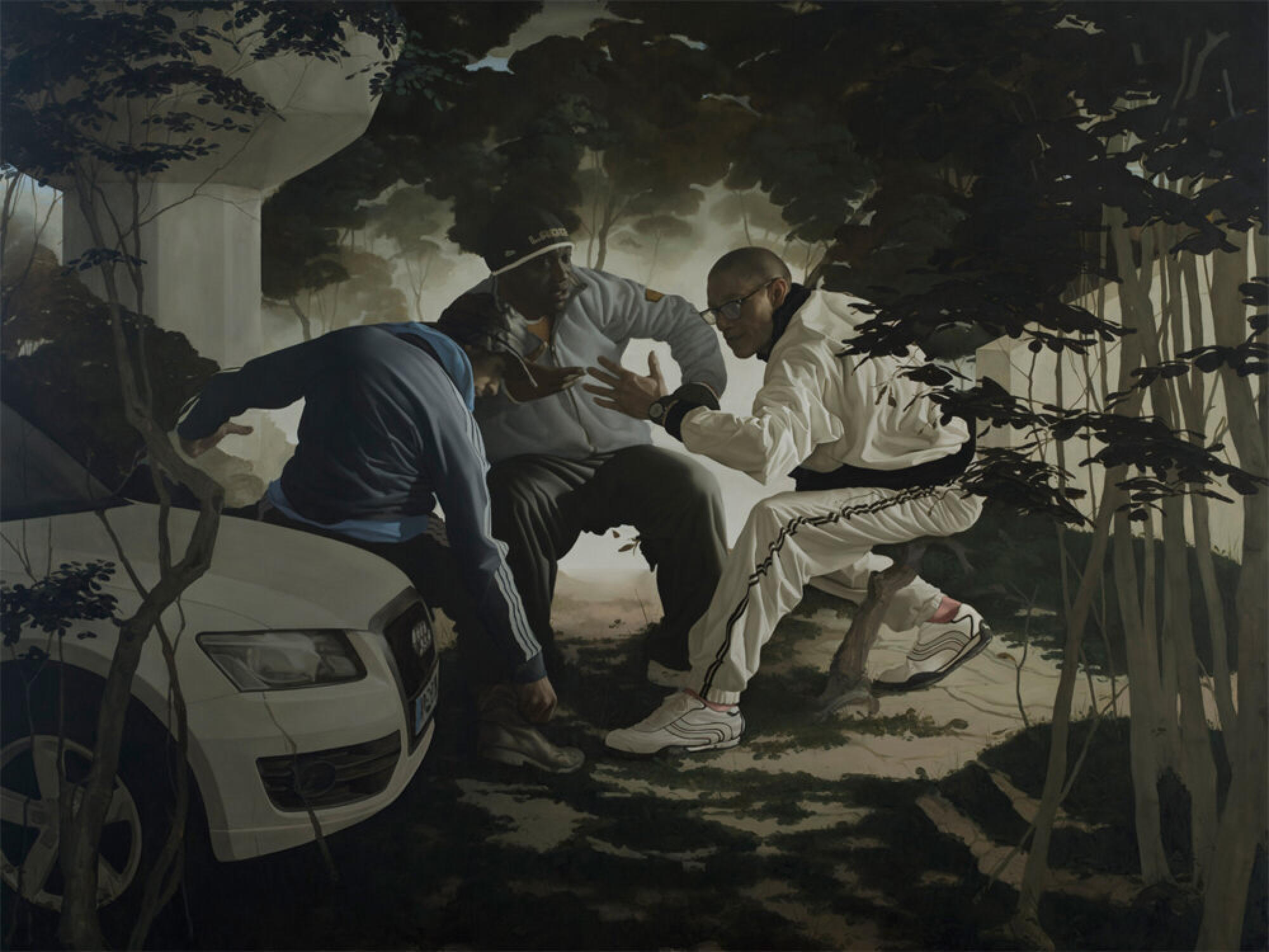 La vie de Guillaume Bresson notamment. S’il peint les quartiers, c’est qu’il en vient, du côté de Toulouse. Il a beaucoup bougé puis a fini son adolescence dans le quartier de Rangueil. Ce sont ses copains de là-bas, surtout, avec qui il faisait du graff, du break, écoutait Lunatic et la Mafia K’1 Fry, qu’il a peint en arrivant aux Beaux-Arts. Là-bas, il se sent toujours ovni. La peinture figurative, c’est plutôt ringard pour l’époque. Il n’y a pas encore de Rackajoo et autres Issy Wood. Il travaille son style, sa méthode. Pour peindre la vraie vie, Guillaume Bresson a besoin de temps et de pratique des corps. Bien qu’ils aient l’air de photos instantanées, chaque tableau lui prend entre 6 et 8 mois de travail. Au son du rap de son adolescence, il orchestre des séances avec des modèles photographiés. Ensuite, il compose, comme une peinture historique, des scènes grandioses.
