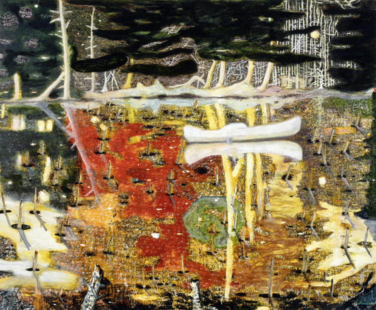Tout d’abord l’Écossais Peter Doig (né en 1966), physique de bûcheron qui peint des paysages éclaboussés de lumière et de sang, une sorte de fauviste de l’an 2000. Sa jeunesse passée à Trinidad puis au Canada a dû accentuer cette fascination pour les décors, la nature, les forêts.