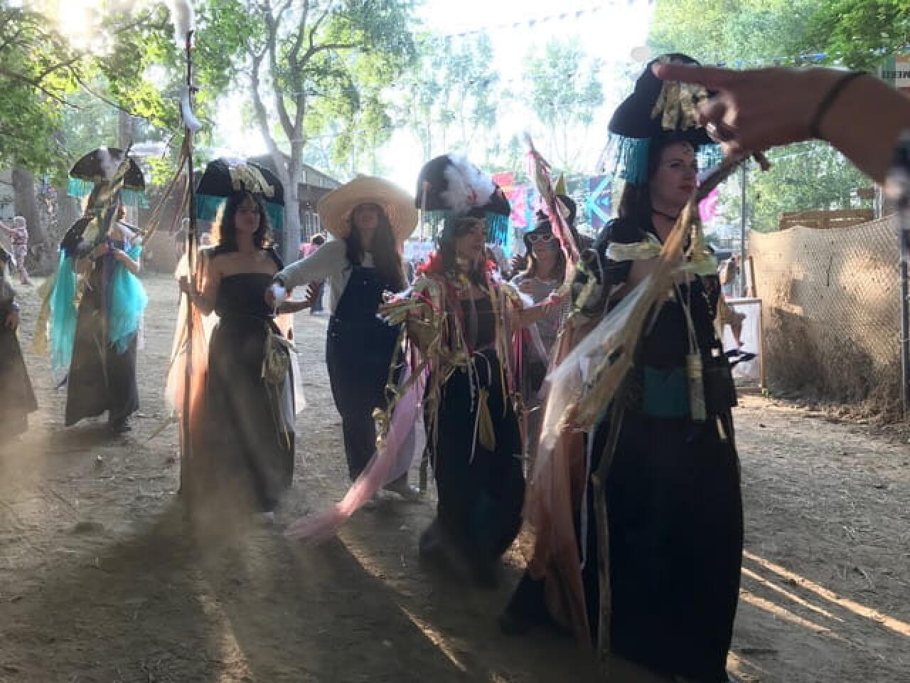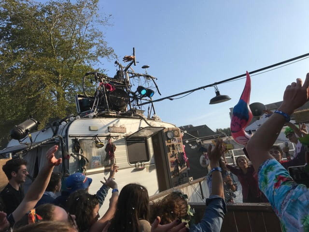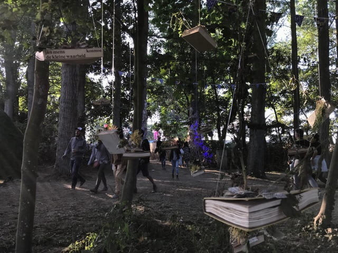 À ce moment là, il est chose aisée d’invoquer les choix qui s’offrent aux déserteurs temporaires des premières lignes de la sono pour reprendre des forces. Une histoire inavouable ? Dans un bosquet anachronique, couchez-le sur papier entouré du son des machines à écrire pour, qu’une fois accrochées à un fil, le vent puisse les chuchoter. Une âme botanique ? Dans une imposante cabane, faites le lien entre les plantes et la terre pour qu’elles chantent leurs mélopées. Une bourrasque théâtrale ? Plongez dans la piscine à boules et tirez de votre corde vocale la jouissance d’entraîner les spectateurs d’un karaoké déluré dans les plus hautes notes de Bohemian Rhapsody. Mal au mic ? Go dans un hamac. Une lubie libertaire ? Déshabillez-vous et rejoignez la cohue du sauna dans lequel la convivialité est de mise et la gêne, proscrite. Peut-être frissonnez-vous ? Que neni, partout brûlent les feux de bois autour desquels se matérialisent les rencontres d’un soir.