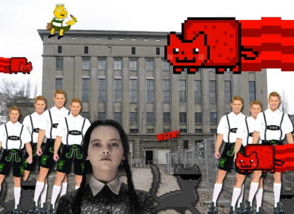 Par exemple ici : “I was sitting somewhere in Berlin surrounded by red and black cat and there were blonde men everywhere.” / « J’étais assise quelque part à Berlin, entourée de chat(s) noirs et rouge et il y avait des hommes blonds partout ». Ce qui donne cette excellent montage qui place Christina Ricci/Mercredi Addams devant le Berghain, entourée de lolcats et de tyroliens.