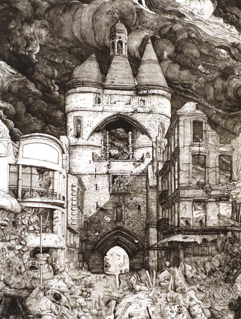 Trois mois durant lequel les esprits curieux ont pu plonger tête la première dans les mystérieuses fantasmagories de l’ancien élève de Jean Delpech. Percées célestes et souterraines, paysages fantastiques, machineries étranges : autant de mondes, de natures et de surnatures vertigineuses, esquissés, sculptés au bronze, dessinés à la plume mais surtout gravés, sur ces minutieuses estampes au burin dont Philippe Mohlitz est l’un des grands maîtres contemporains. Exemple, avec cette vision apocalyptique de la fameuse Grosse Cloche de nos rues bordelaises ; un frisson orageux parcourt l’échine …