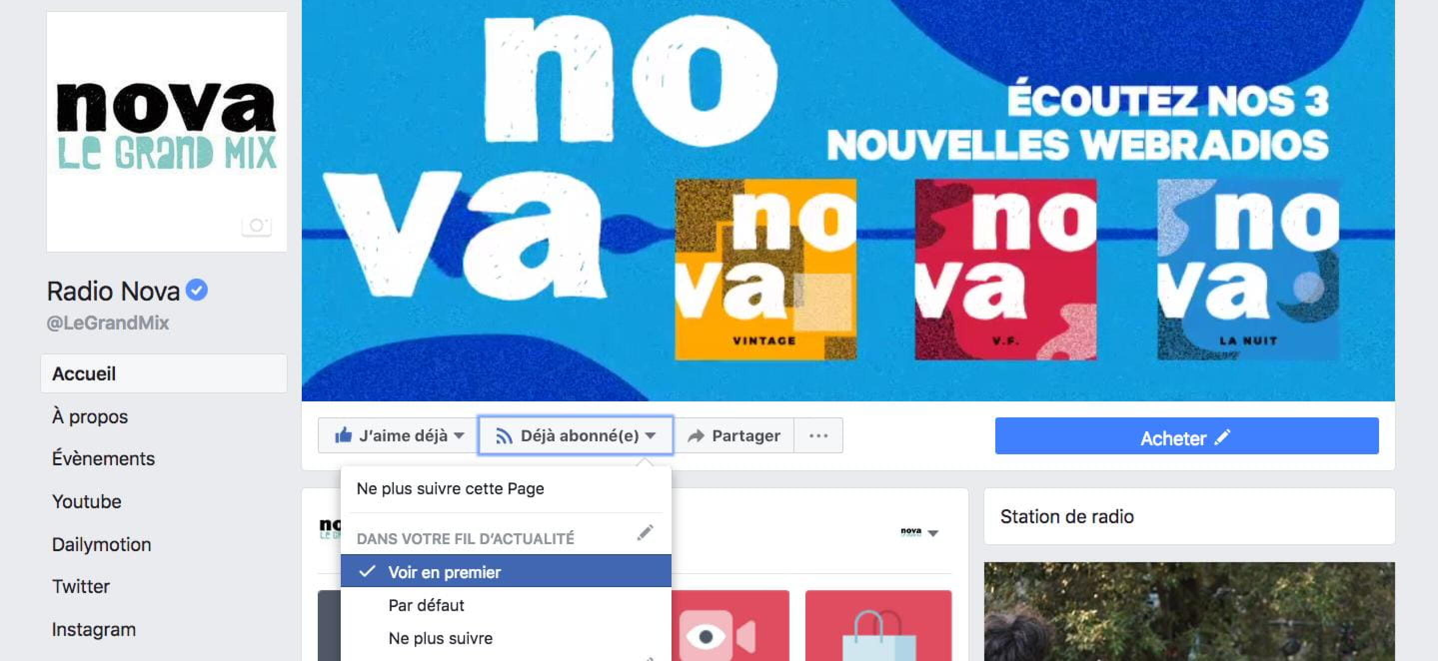 Rendez-vous sur la page Facebook de Radio Nova, cliquez sur “S’abonner” ou “Déjà abonné(e)”. Un menu déroulant apparaît, et vous n’avez qu’à sélectionner “Voir en premier”. Le tour est joué : Facebook ne vous cachera plus nos meilleurs contenus !