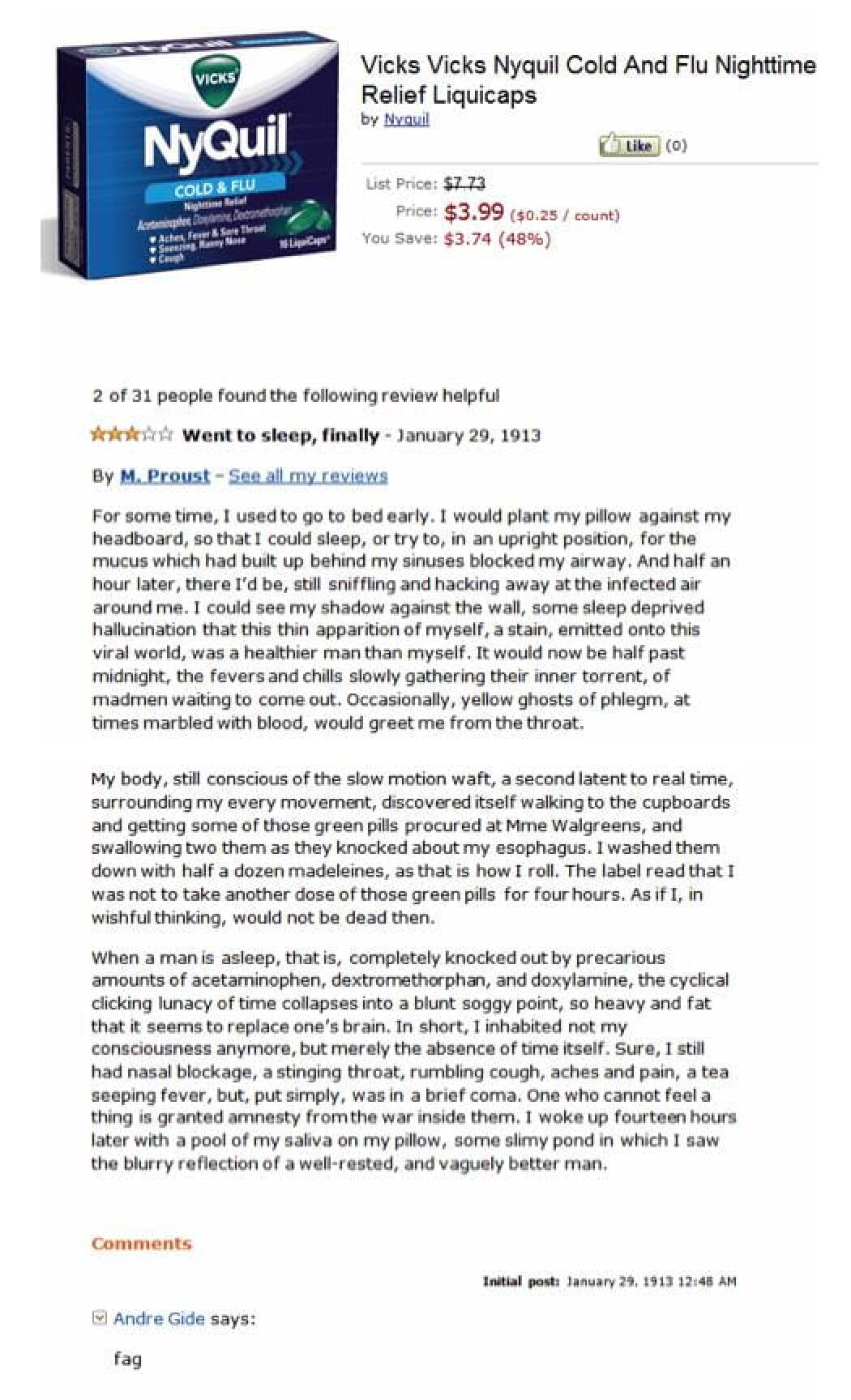 Comme le rapportent, non sans malice, les défricheurs de The Drone, LA perle médicino-littéraire nous vient tout droit du laboratoire Vicks qui vante sur Amazon les mérites d’un de ses médicaments contre la grippe avec une traduction du début de Du Côté de chez Swann (Tome I de la Recherche).