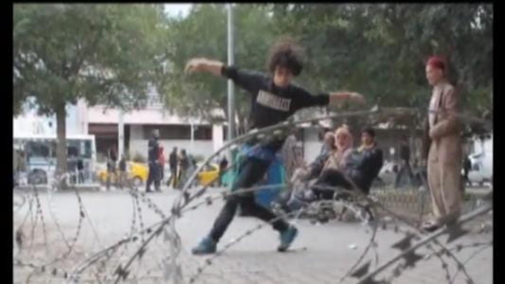 Dans les rues de Tunis, une bannière quireprend une citation de Stéphane Hessel connue de tous les mouvements contestataires : « Résister c’est créer, créer c’est résister ». Juste en essous, un danseur hip-hop s’élance et entame quelques pas de breakdance.