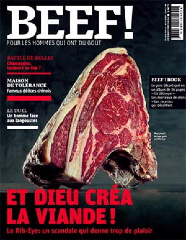 Pas subtile du tout, Il y a d’abord le magazine BEEF, qui, tel le Coca Zéro, s’adresse aux hommes, aux vrais, ceux qui mangent de la bidoche et qui ont du jus qui leur coule sur le menton. Le magazine est sous titré  “Pour les hommes qui ont du goût”. Femme, passe ton chemin, ici on mange de la grosse viande, on la découpe avec les dents ou de gros couteaux pointus et même la pêche à la langouste devient épique dans un article intitulé :