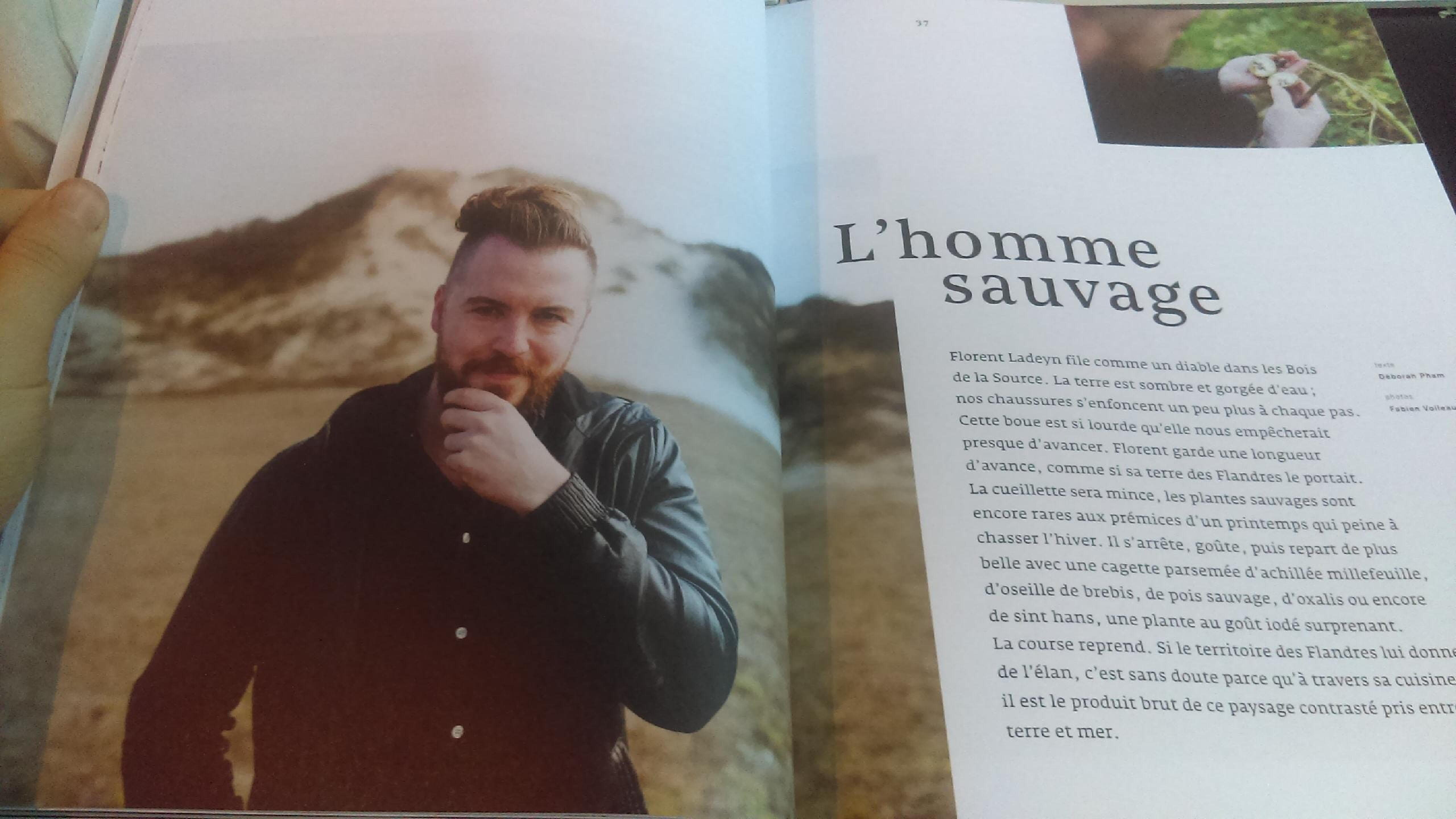 Dans le magazine Mint, curieux gratuit très agréable à lire, j’ai l’impression que j’ai trouvé un mix des deux : un jeune chef tatoué, avec un bun sur la tête, mais qui je cite « file comme un diable dans les bois de la source » et surtout est un peu colère.  Florent Ladeyn est « l’homme sauvage » selon Mint – on reste dans un certain champs lexical, celui de l’homme non apprivoisé, et il en a marre du boeuf de kobé :