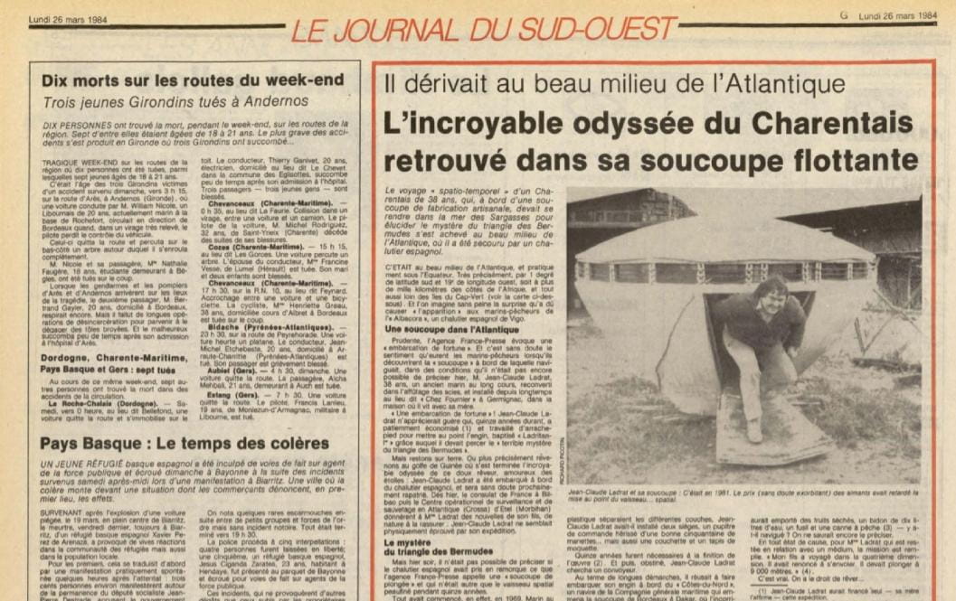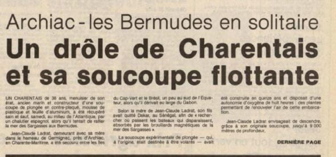 Boîtes de conserve, café, riz, pâtes, réchaud à gaz, fusil 22 long riffle… tout est prêt. Un bateau de pêche le remorque jusqu’au large. C’est le début de 90 jours de cauchemar. La soucoupe est ballotée, elle tourbillonne et danse sur elle-même de haut en bas, comme un bouchon à la dérive. Ladrat, qui n’a aucune maîtrise sur la navigation, est obligé d’écoper une demi-heure toutes les deux heures pour évacuer l’eau qui s’infiltre dans son navire. Ce n’est pas tout : il a oublié son ouvre-boîte – et ne se rendra compte qu’à la fin de son aventure qu’il était en fait bien rangé au fond de ses affaires de voyage. Il se nourrit tant bien que mal en pêchant poissons, algues et perd plusieurs dizaines de kilos. Le 25 janvier, un énorme poisson mord à l’hameçon. Un requin de 16 livres environ. Il l’immortalise avec son appareil photo et décide de l’abattre avant que lui-même ne lui serve de goûter. La chair du requin qu’il a remonté à bord rend Jean-Claude malade. Il désespère, pense au suicide. S’accroche en rêvant d’étoiles et de verdure. « Le printemps est arrivé. Saison de renouveau, de vie et d’espoir. Je ne conçois pas la mort au printemps. L’automne ou l’hiver d’accord, ce sont des époques où l’on peut s’éteindre. Mais pas maintenant, je suis trop jeune je veux revoir la campagne, les bourgeons, le vert charentais tout tendre, un peu chlorosé par les terrains calcaires ». Un thonier, l’Albacora-VI, exhausse son vœu. Le navire espagnol aperçoit le « Ladritan I » le 23 mars et vient au secours de son capitaine de pacotille. Le 26 mars 1984, le journal Sud-Ouest titre : « Archiac – Les Bermudes en solitaire. Un drôle de Charentais et sa soucoupe flottante ». Jean-Claude Ladrat publie dans la foulée son récit, Le Don Quichotte des Bermudes.
