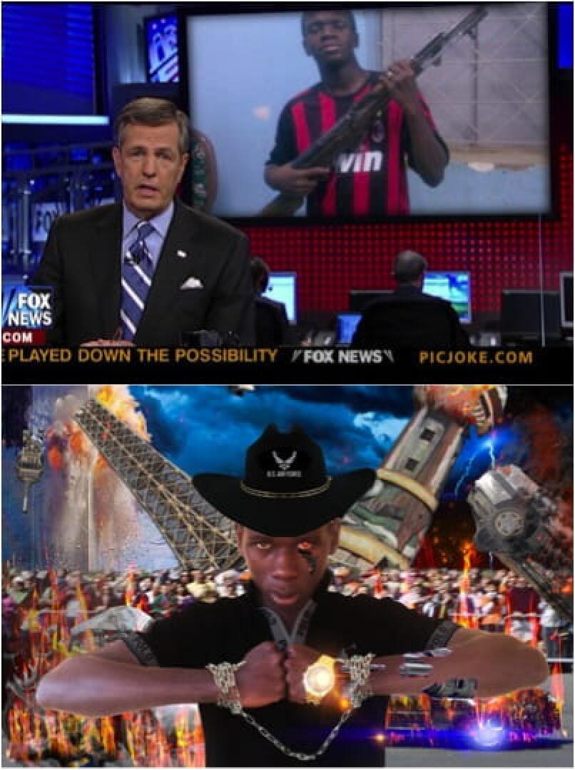 Ou encore ce garçon à kalachnikov à la une de Fox News, enfin au cœur de l’attention mondiale, tandis que celui qui pourrait être son cousin détruit la Tour Eiffel à la force de ses poings – tout en arborant une montre dont même Sarkozy serait jaloux…