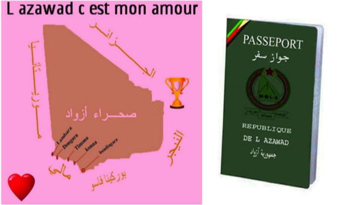 Enfin, sur fond rose, les contours de l’Azawad – cette région du Nord du Mali que les Touaregs rêvent indépendante – se dessinent à travers un passeport et une déclaration d’amour.