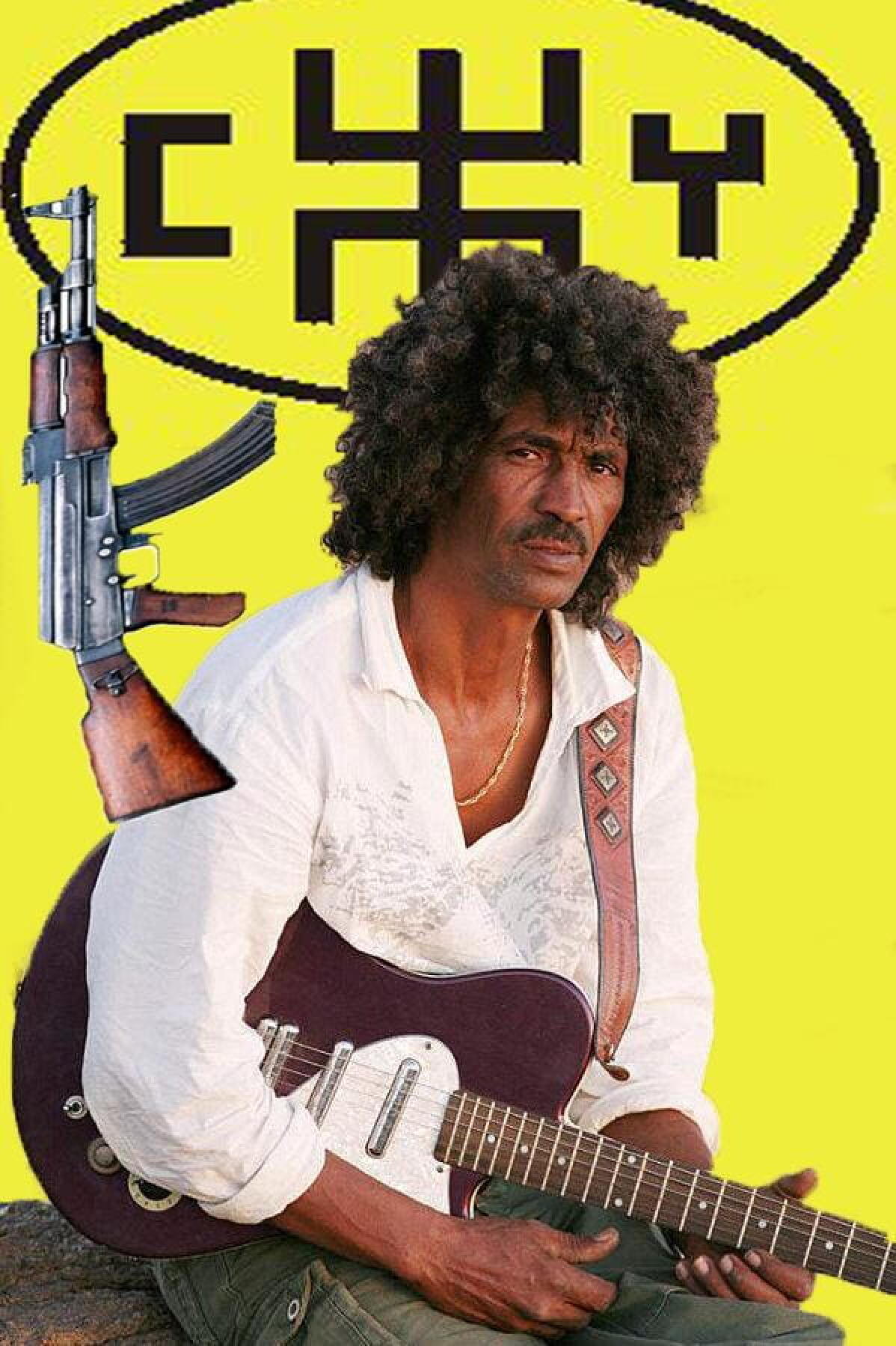 Ainsi l’un des membres du groupe de blues touareg Tinariwen se retrouve sur fond jaune, la guitare électrique a remplacé le fusil (raccroché) des camps d’entraînement de Kadhafi…