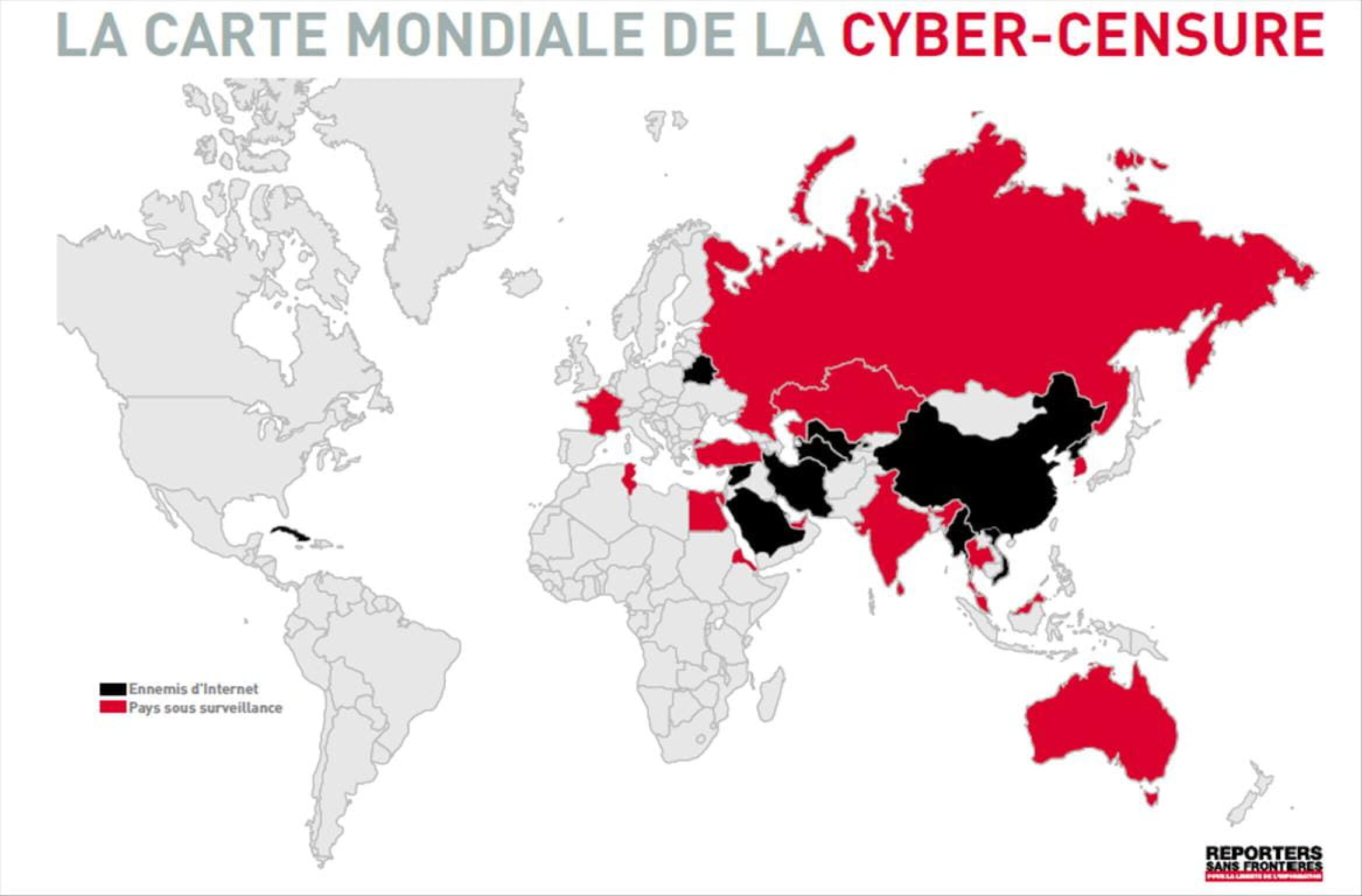 Carte de la cybercensure en mars 2012 de Reporters Sans Frontières.
