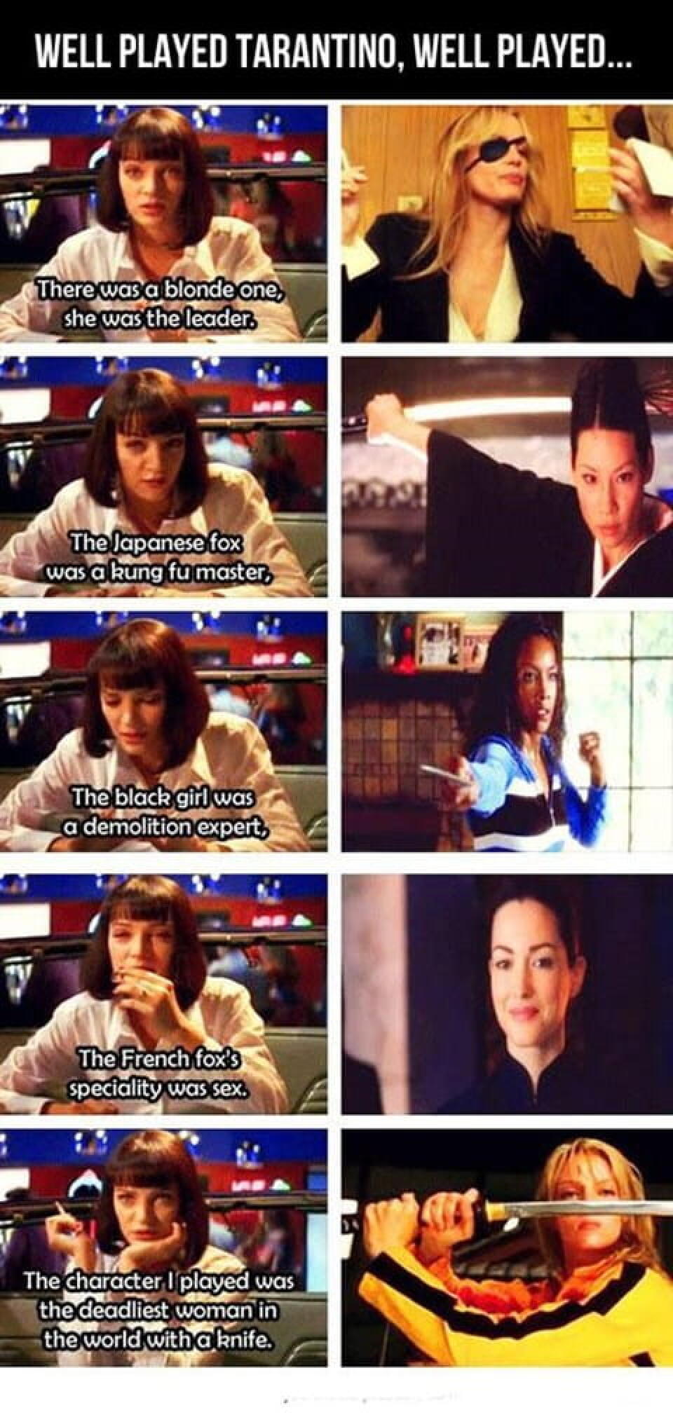C’est ainsi que dans Pulp Fiction, qua Mia Wallace (Uma Thurman) parle de l’épisode de Fox Force dans lequel elle tourne, elle décrit à Vincent Vega l’intrigue exacte de Kill Bill, et elle évoque un rôle qu’elle jouera réellement dans Kill Bill…