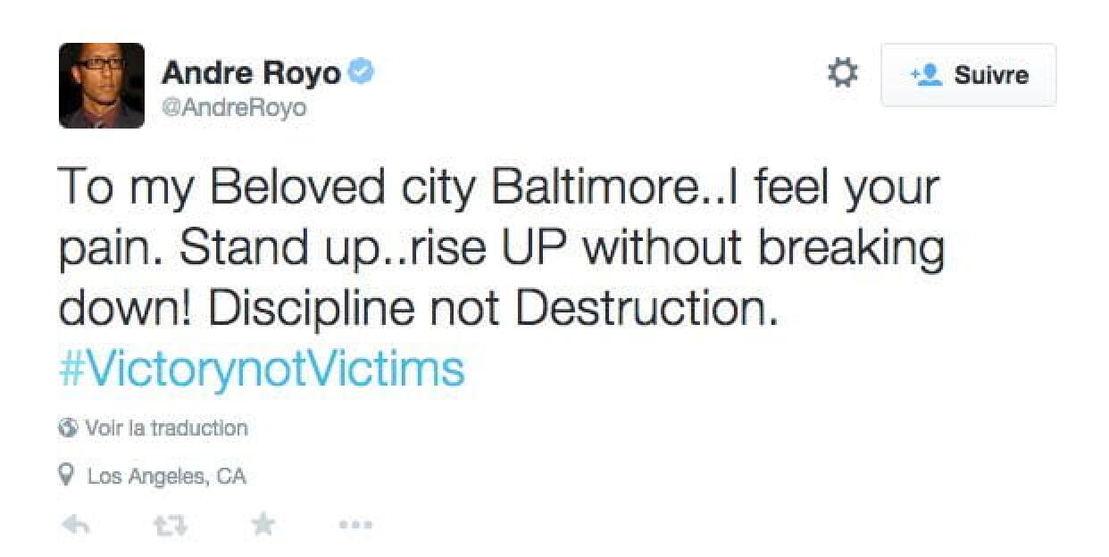 « A ma bien-aimée Baltimore, je comprends votre douleur. Levez-vous, restez debout mais sans tout détruite. De la discipline et non de la destruction. #LaVictoirePasdeVictime. » dit ainsi Bubbles.