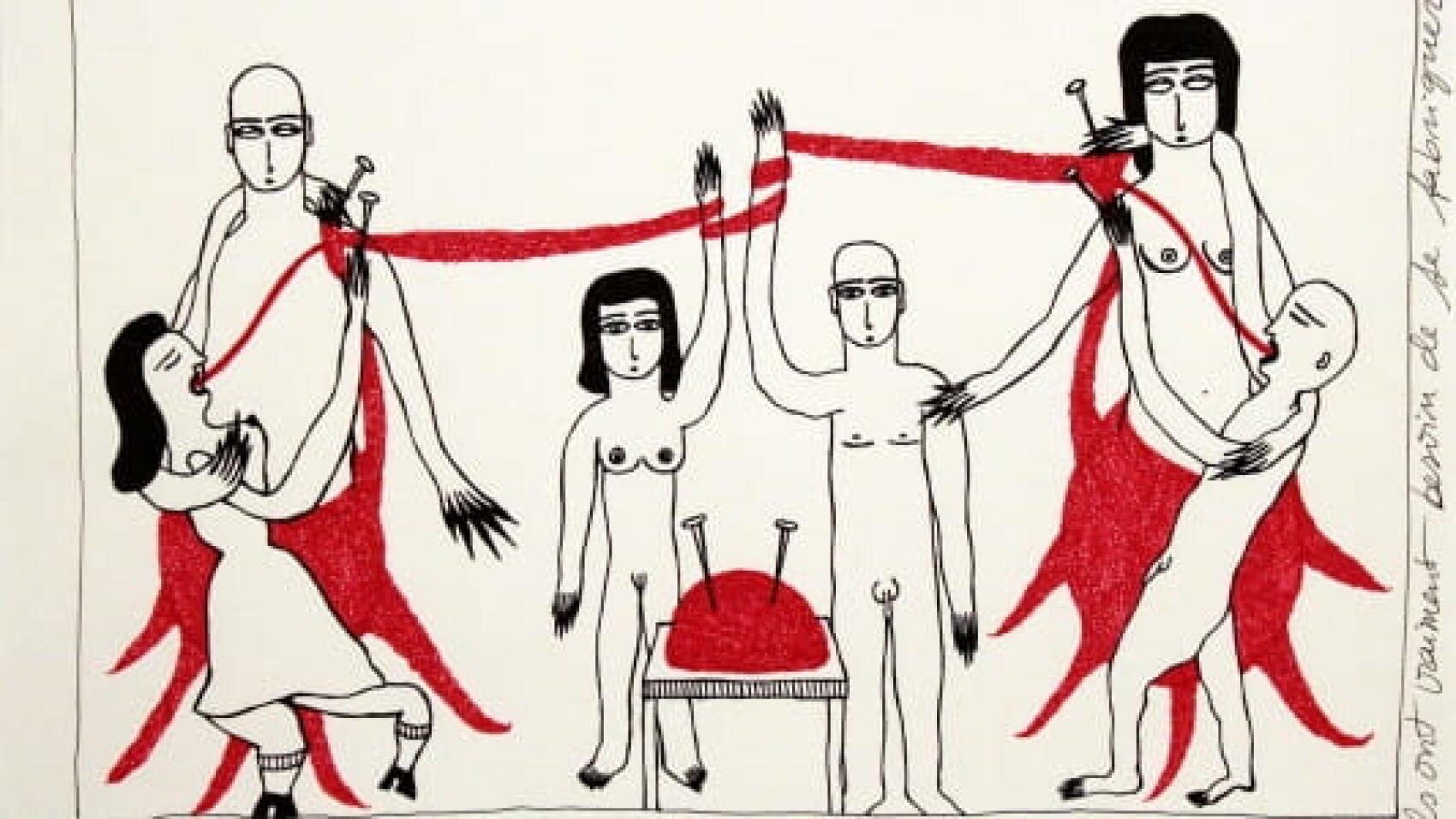 Des scénographies étranges, des cérémonies secrètes, des scènes dépouillées et truffées de symboles forts, occultes, angoissants, puissants : beaucoup d’abeilles, des femmes subissant des tortures, des personnages masqués, des affuteurs de lames, des tresseurs de fourrures, du liquide sous forme d’eau, sang ou larmes. Marilena tisse un monde fantasmagorique qui n’est pas sans rappeler les pratiques magico-religieuses de son Brésil natal. Le tout dessiné à la mine de plomb ou au stylo bille sur carton ou au crayon de couleur sur papier calque.