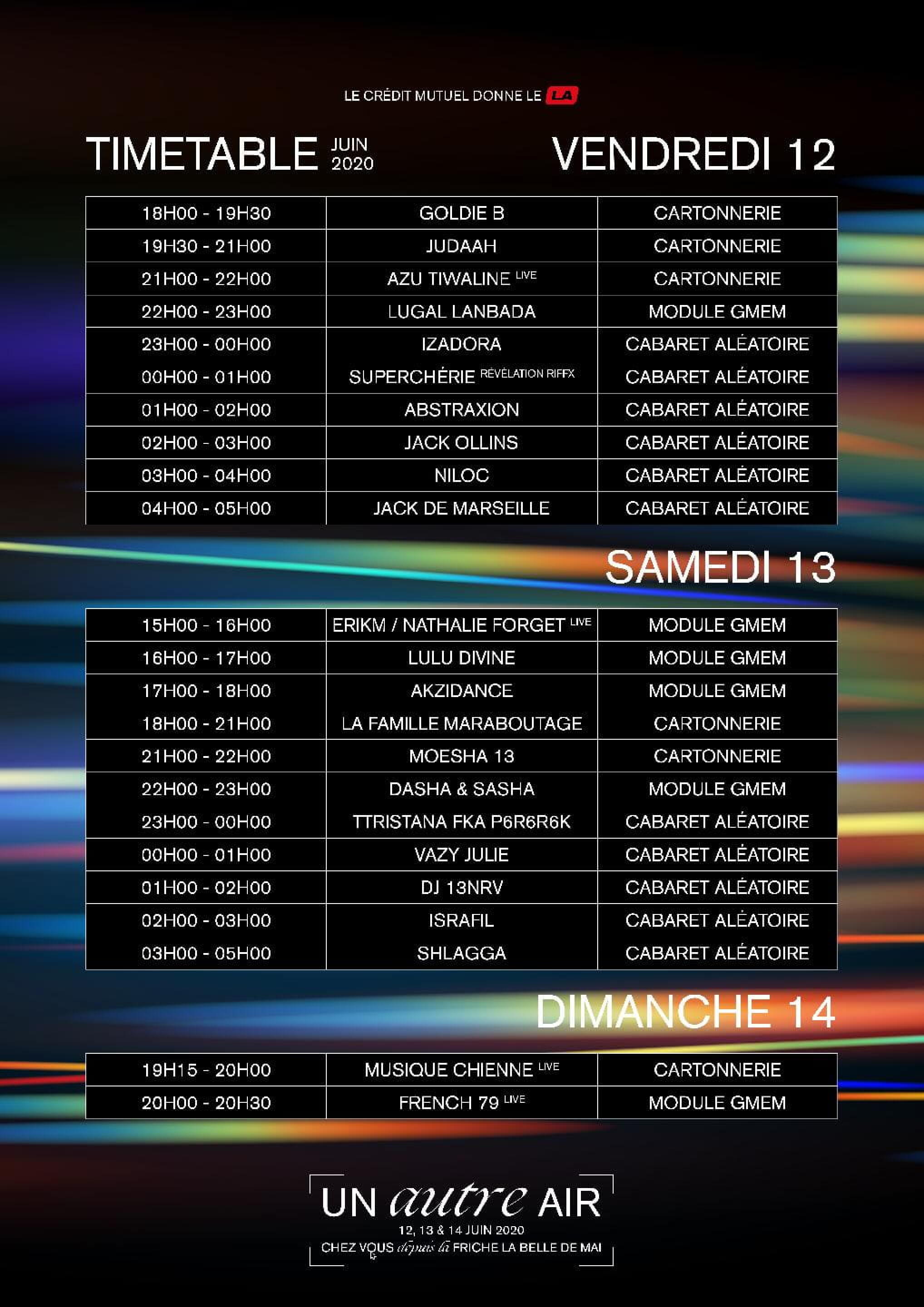 Un autre air… que celui que vous avez respiré durant trois mois et dans le périmètre, nécessairement réduit, de votre logement ? C’est ce que vous propose, tout de même, le festival qui, via des noms qui parleront aux plus renseignés (Jack de Marseille, Moesha 13, Vazy Julie…) et à ceux qui ont déjà pu vibrer avec nous en Nuits Zébrées (Musique Chienne, French 79), vous propose de voir les lives que vous ne pourrez pas voir en live… en streaming. La Friche Belle de Mai restera sans public physique et vous constituerez le public virtuel. Voilà, pour les semaines à venir, la nouvelle norme.