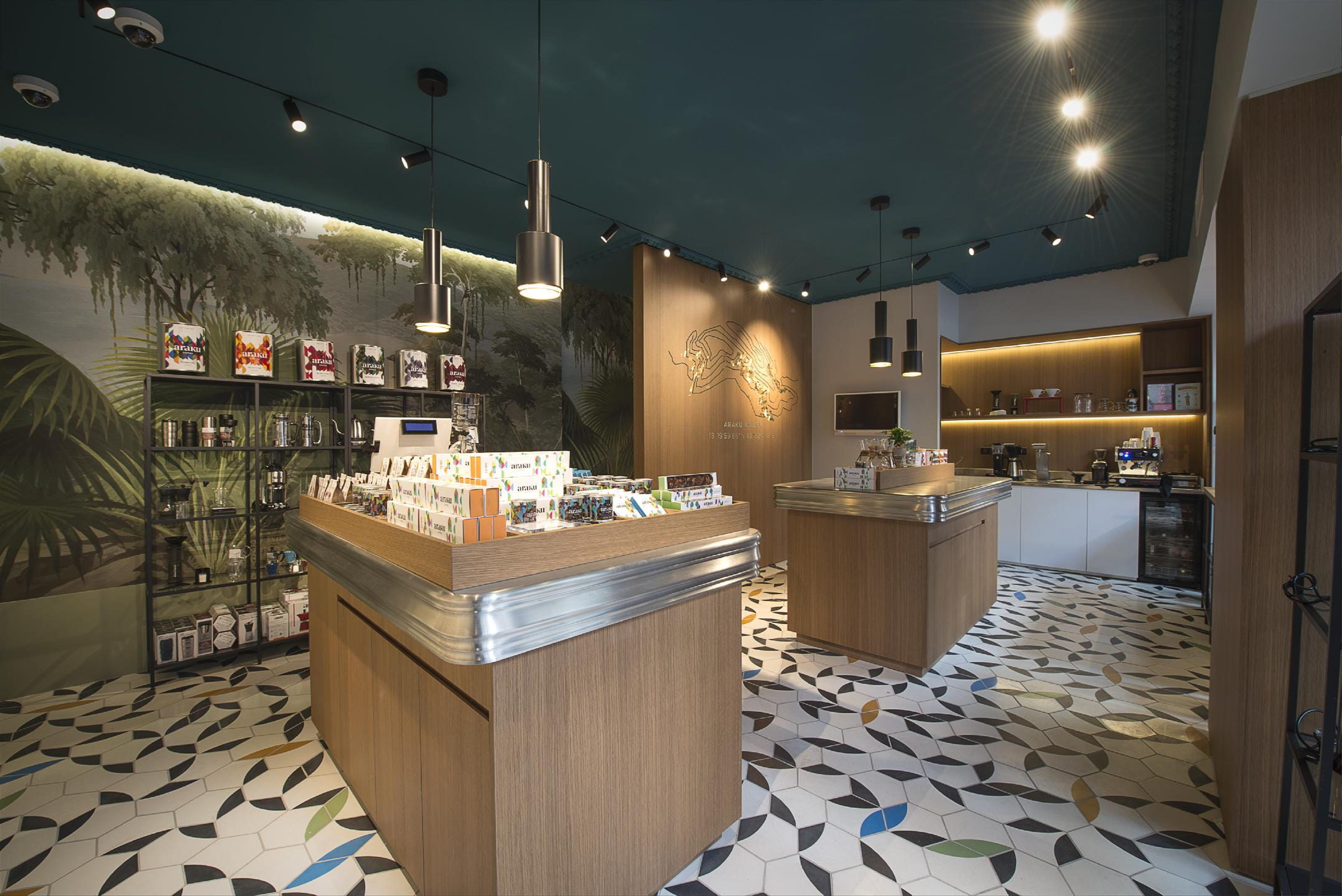 Puisque la démarche fonctionne et que tout le monde y trouve son compte, il faut désormais la faire connaître. Et c’est l’ambition que se donne Araku en ce mois de février en ouvrant sa première boutique à Paris. L’objectif est d’ouvrir une fenêtre directe sur la vallée d’Araku, tout en s’intégrant avec intelligence dans l’environnement urbain de Paris. Cela se ressent dans le café, où la nature envahit la boutique au travers d’illustrations, de jeux de matières et de plantes, pour transposer les clients en Inde. Une carte en bois sculptée permet de comprendre l’organisation du terroir Araku avec 4 villages et leurs parcelles. A cela s’ajoutent le comptoir en zinc, les carreaux de ciment et les moulures qui font évidemment penser aux bons vieux cafés parisiens.