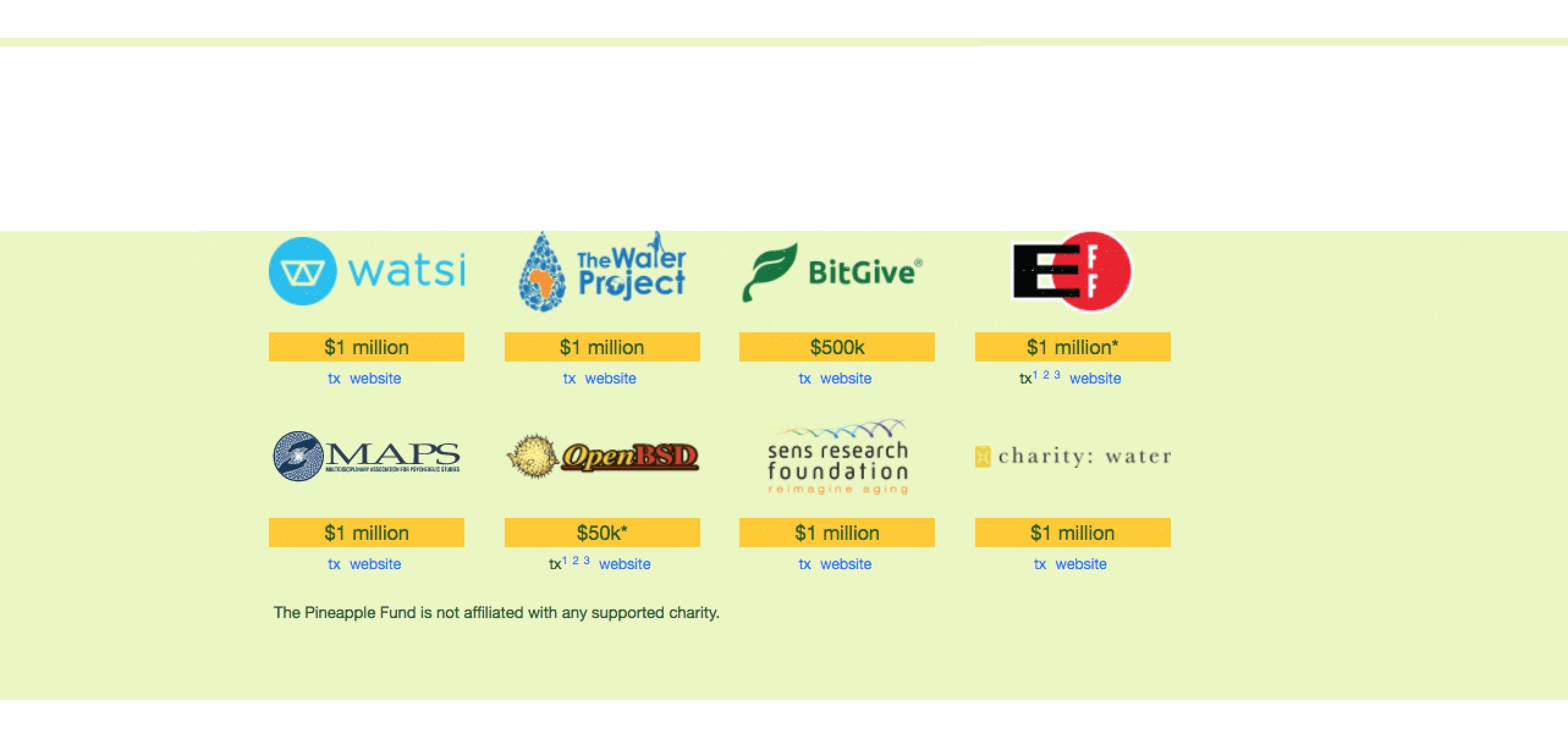 Enfin une autre histoire associée au bitcoin fait actuellement du bruit. Une autre personne qui souhaite taire son identité affirme posséder 86 millions de dollars de Bitcoin. Une somme qui va bien au-delà de ce qu’il pourrait dépenser, et qu’il a donc décidé de donner à des œuvres de charité, via une fondation : The Pineapple Fund. Sur le site on peut trouver un registre avec la liste des associations caritatives a qui il a donné l’équivalent de 8 millions cinq cent mille dollars en Bitcoin, à 8 associations différentes. Le site affiche même le code blockchain de chacune des 8 associations listées pour une transparence totale.