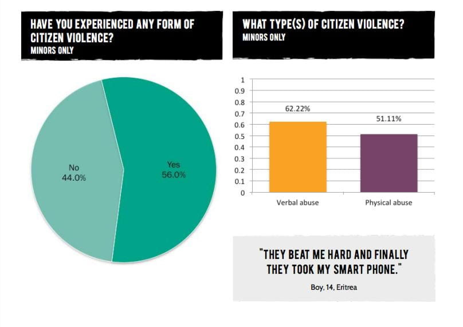 Un érythréen de 21 ans explique également que les insultes racistes sont monnaie courante, mais qu’une fois, « ils m’ont jeté quelque chose d’explosif. Une autre fois, ils m’ont jeté des ordures au visage. C’était horrible, à tel point que je me suis demandé si j’étais vraiment en Europe. Je n’ai jamais connu ce genre de traitement, même lorsque j’étais en Libye. »
