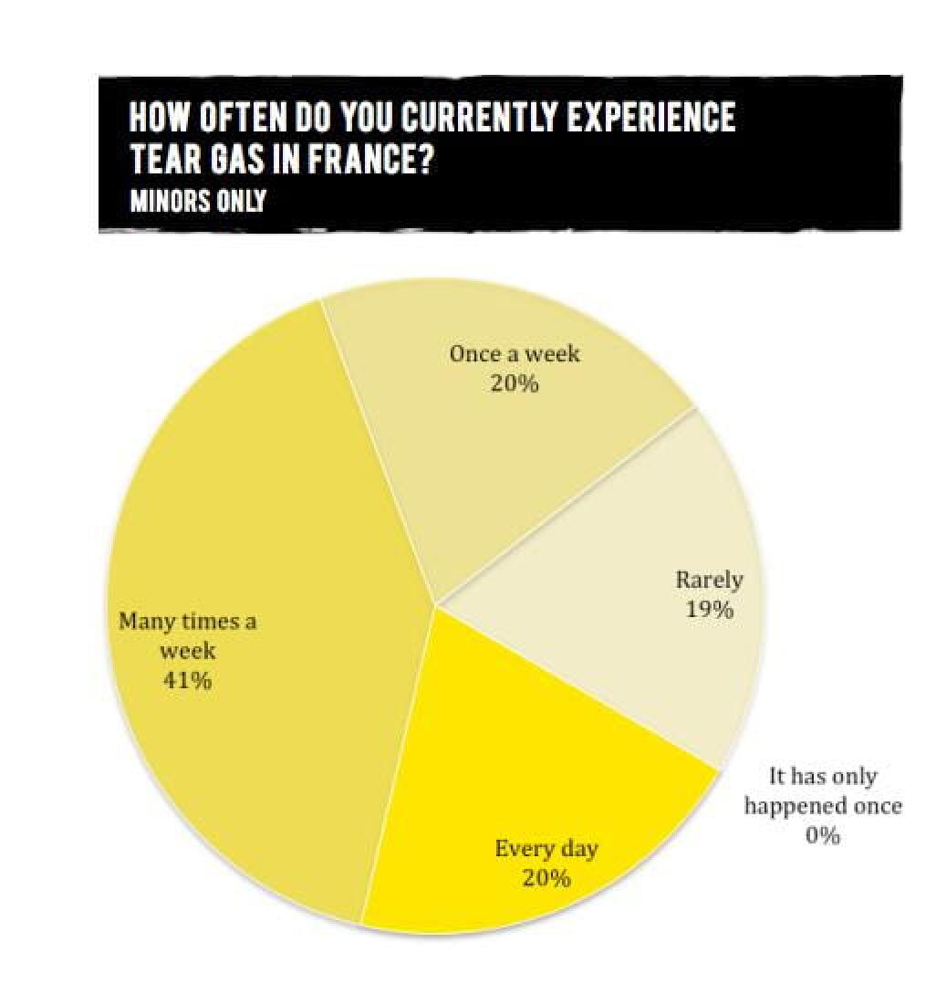 Les violences policières sont aussi largement dénoncées, sur les enfants comme sur les adultes. Parmi les mineurs interrogés, 96% disent avoir subi des violences policières. 79% en raison de gaz lacrymogènes, 56% parlent d’autres formes de violence, 21% parlent d’insultes de la part des forces de l’ordre.
