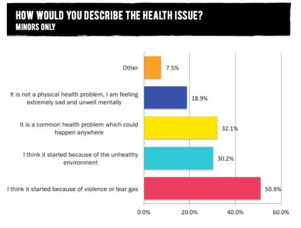 À peine la moitié d’entre eux ont reçu une aide médicale. 50% déclarent que ces problèmes sont (ou étaient) dûs aux violences ou aux gaz lacrymogènes.