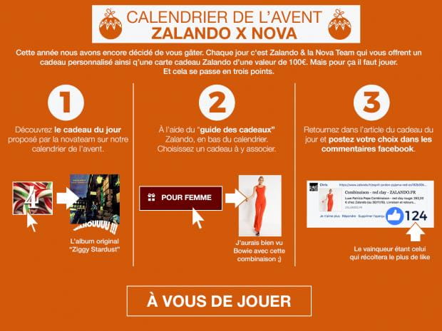 Chaque jour Zalando & un des membres de la Nova Team vous régalent en vous offrant un cadeau choisi spécialement pour vous, ainsi qu’une carte cadeau Zalando d’une valeur de 100€.