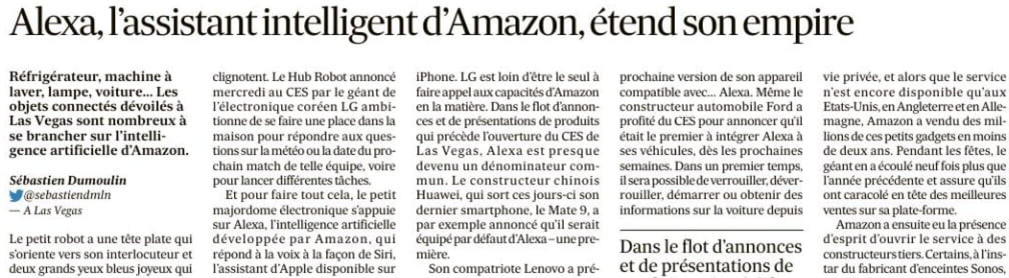 Au CES, précise Les Échos, on a vu toute sorte d’objets qui se sont équipés avec Alexa : frigidaire, machine à laver, enceinte…