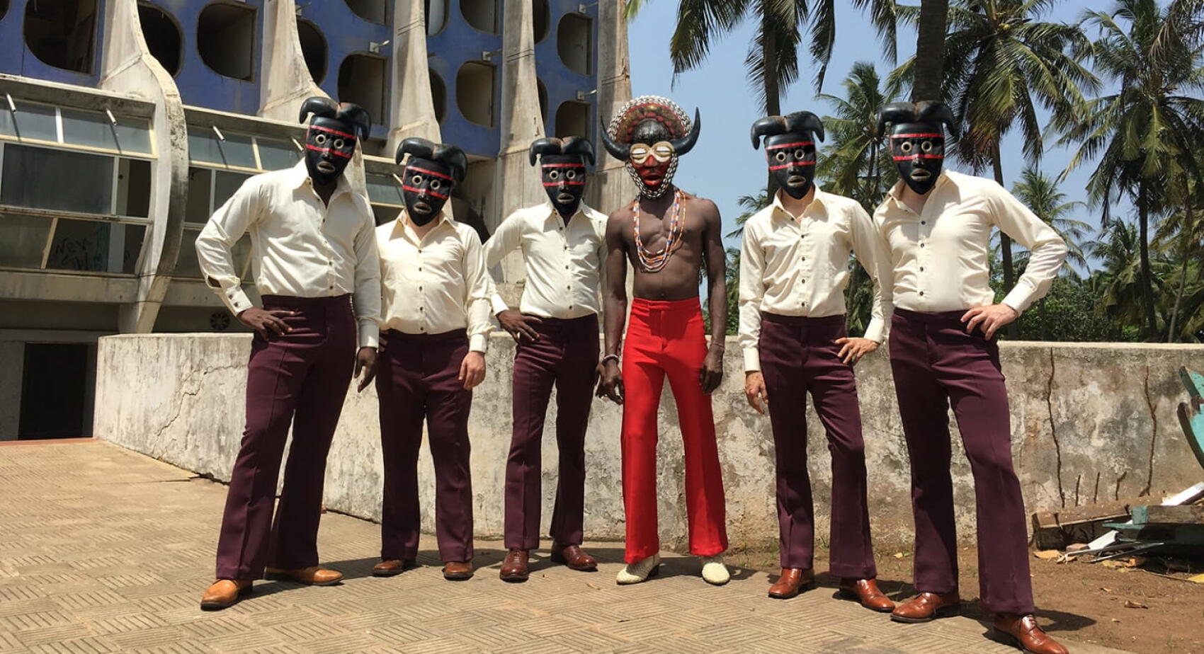 Dites … Pardon de vous déranger mais je crois bien qu’un drôle de bonhomme vous fixe. Si, si, là, au-dessus de ces petits carreaux jaunes, figé dans une posture qui évoque une danse stoppée de manière impromptue. Ça m’étonne que vous ne l’ayez pas vu, parce qu’il a une dégaine plutôt comaque. Pantalon rouge, bottines crèmes, colliers vaudou et le visage dissimulé derrière un masque à cornes représentant le dieu Sakpata ; c’est pas exactement la tenue qu’on vous conseillerait de mettre pour un premier rendez-vous avec votre conseiller Pôle Emploi. Jugez plutôt.