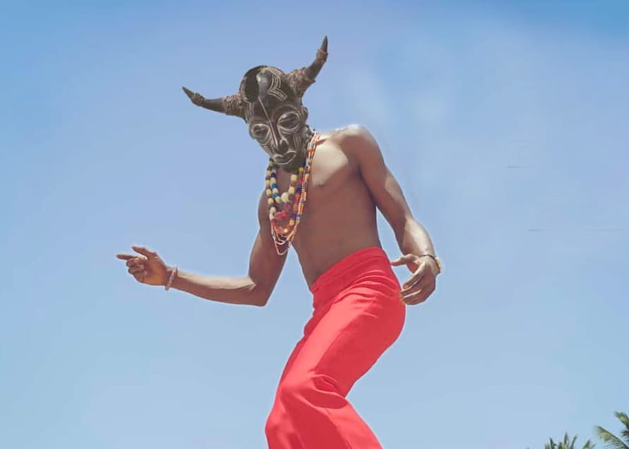 Dites … Pardon de vous déranger mais je crois bien qu’un drôle de bonhomme vous fixe. Si, si, là, au-dessus de ces petits carreaux jaunes, figé dans une posture qui évoque une danse stoppée de manière impromptue. Ça m’étonne que vous ne l’ayez pas vu, parce qu’il a une dégaine plutôt comaque. Pantalon rouge, bottines crèmes, colliers vaudou et le visage dissimulé derrière un masque à cornes représentant le dieu Sakpata ; c’est pas exactement la tenue qu’on vous conseillerait de mettre pour un premier rendez-vous avec votre conseiller Pôle Emploi. Jugez plutôt.