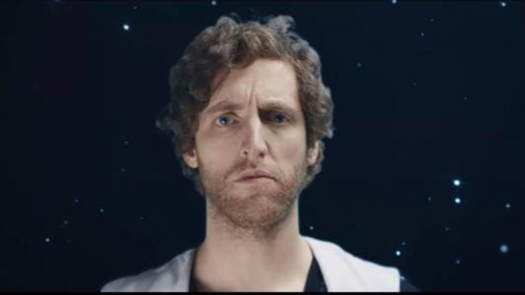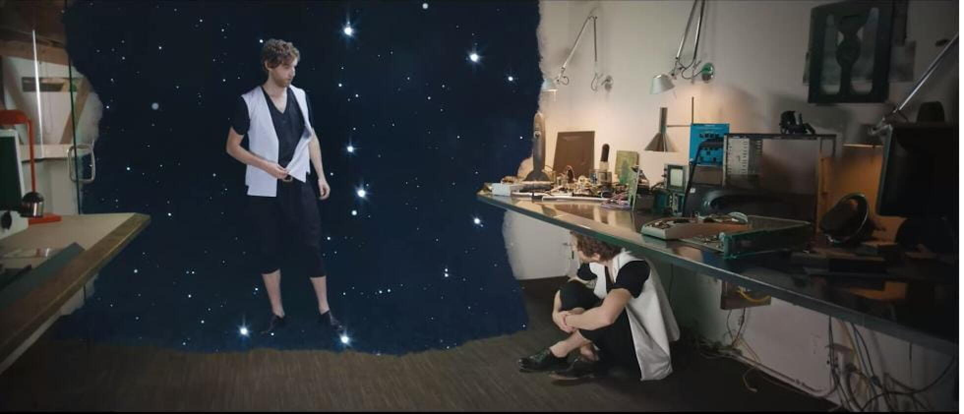 Benjamin n’a pas réalisé le film. Ca, c’était le boulot d’Oscar Sharp qui a tourné le film issu du scénario lors du festival britannique Sci-Fi London. Ou plutôt, qui a tenté de réaliser tant les dialogues sont peu cohérents. En regardant le film (visible ici), on a l’impression que chaque personnage est autiste, incapable de rebondir sur ce que l’autre lui fait remarquer. Finalement, Sunspring prend des airs d’oeuvre absurde, poétique malgré elle : en didascalie, Benjamin avait écrit « Il se tient dans les étoiles et assis sur le sol. » L’image ci-dessus montre comment le réalisateur l’a imaginée. Finalement, on dirait presque une scène d’un film de Michel Gondry.