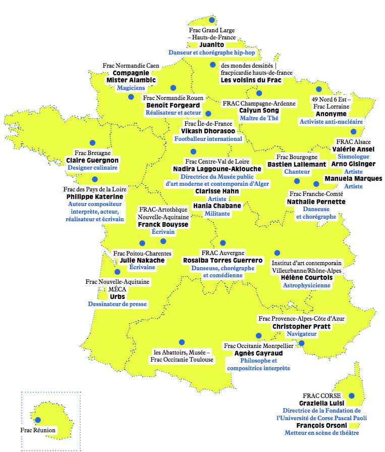 Pour cette quatrième édition, les Frac invitent des personnalités le plus souvent extérieures au monde de l’art à venir à votre rencontre afin de porter un regard inédit sur la collection. Vous pourriez y rencontrer l’astrophysicienne Hélène Courtois, le footballeur Vikash Dhorasoo, notre cher auteur-compositeur Philippe Katerine, le dessinateur Urbs, le réalisateur Benoît Forgeard, l’écrivain Franck Bouysse, la danseuse Nathalie Pernette, la philosophe Agnès Gayraud, la sismologue Valérie Ansel, le navigateur Christopher Pratt ou encore un activiste anti-nucléaire et bien d’autres encore!