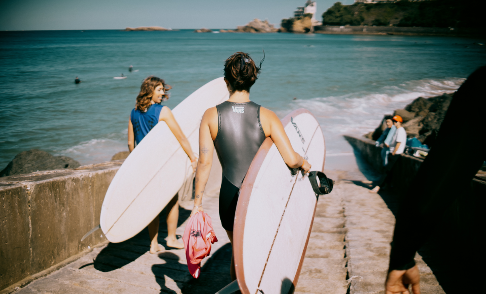En longeant la côte pour arriver au festival, on s’émerveille de cette avenue bordée par l’azur de la mer, où vient se reposer l’éclat du soleil... et où viennent s'éclater des surfeuses venues du monde entier. C’est jeune, vivace et musical. On est en septembre, mais l’été n’est pas fini, en tout cas pas ici. Biarritz est touchée par une vague de chaleur entre 90 et 120 BPM ; on a trouvé le coupable : le Queen Classic Surf Festival.