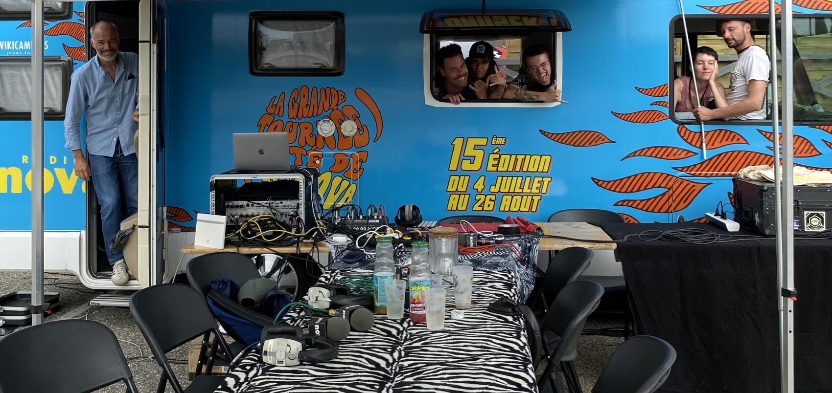 Le camping-car enflammé de Radio Nova se pose sur la Plage Centrale de Lacanau Océan.